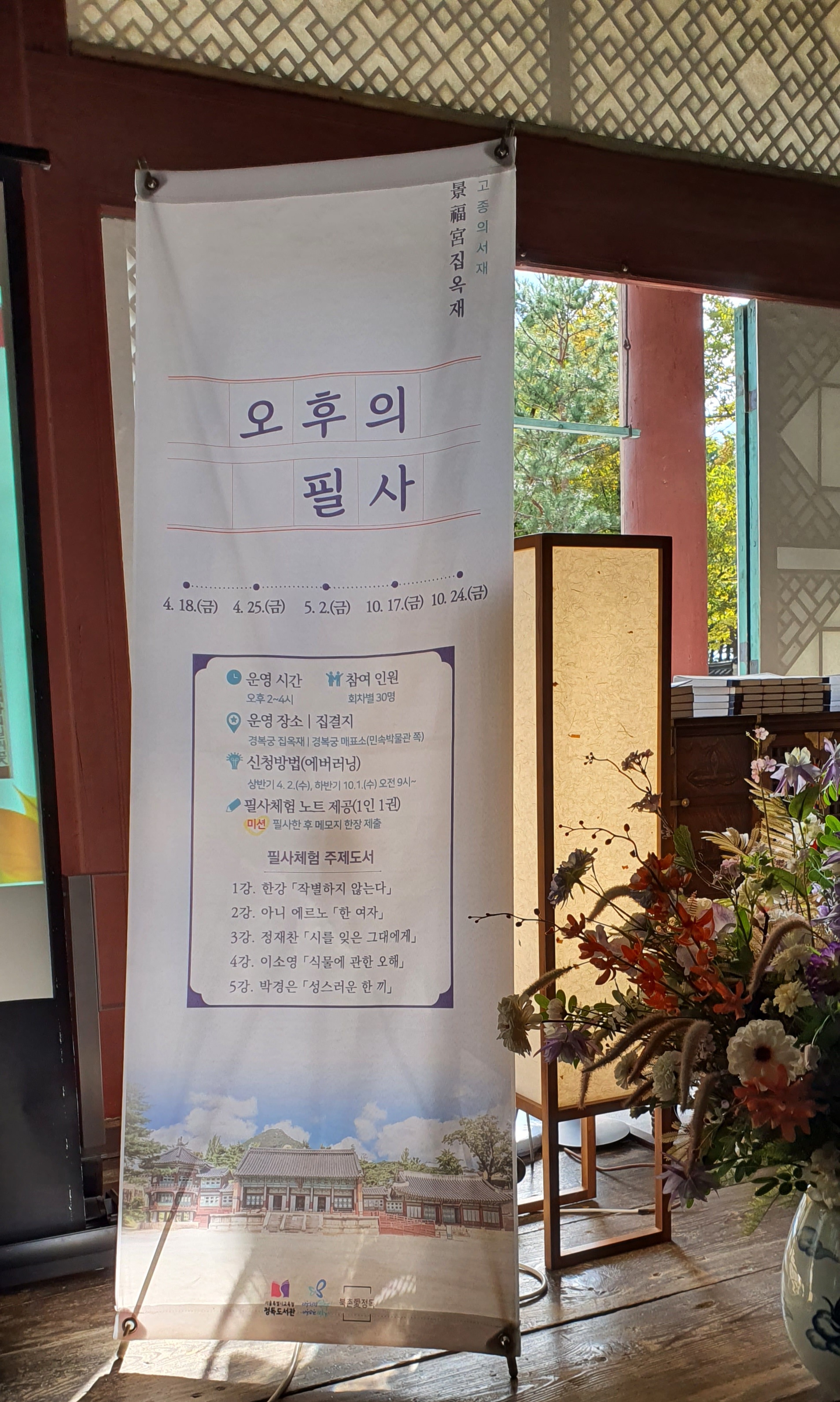 오후의 필사. 경복궁 집옥재 2025년 10월 24일 금요일, 정독도서관 주최로 에서 필사 체험시간을 가졌습니다늘 책을 읽으면서 휴대폰 메모란에다 터치 펜을 이용해서 필사를 하고 있지만,펜과 노트를 이용한 필사는 오랜만이라 다소 흥분도 되고 긴장감이 돌았습니다.모 방송국에서 촬영을 나와 여기저기 돌아다니며 찍어대니 더 신경이 쓰이는군요.그러나 조선왕조 사양길에 힘든 시간을 이 서재에서 보냈을 고종을 그려보노라니 어느새 마음이 차분히 가라앉습니다. 책 ·영화 ·강연 이야기/책 2025.10.24